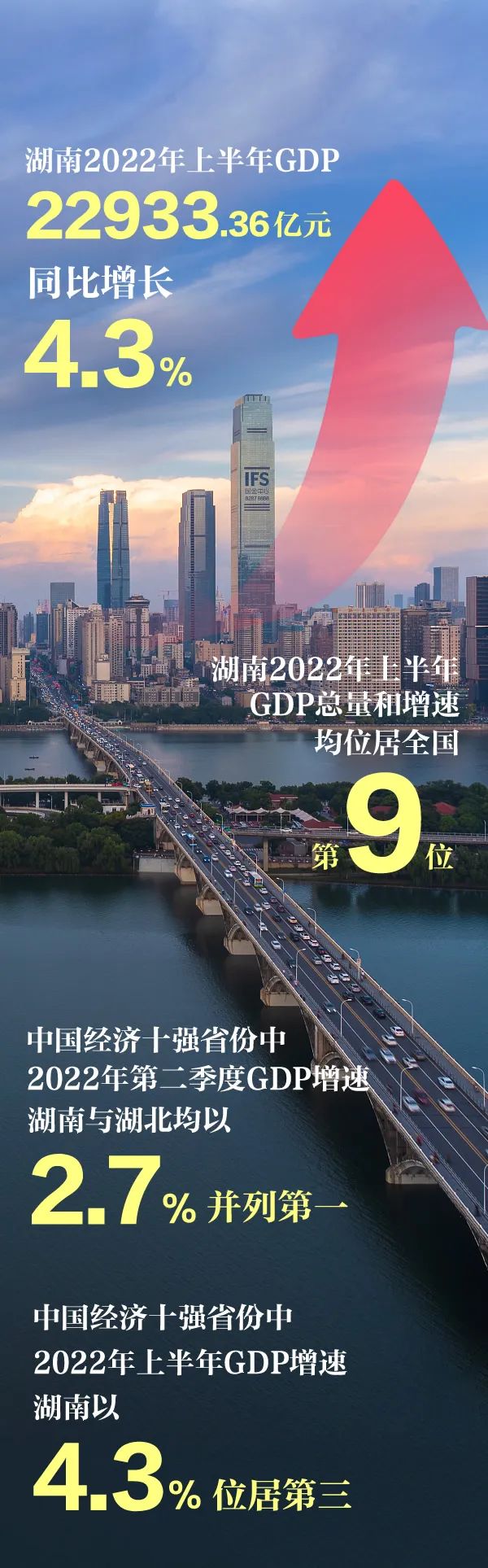 截至今年上半年,湖南GDP总量为22933亿元,排在全国第9位,续写了湖南半年经济GDP总量连增的发展传奇;湖南的GDP增速也排在全国第9位(与内蒙古并列),但在经济十强省中,湖南的增速却很靠前,且呈现来势向好、稳中有进的良好态势。
