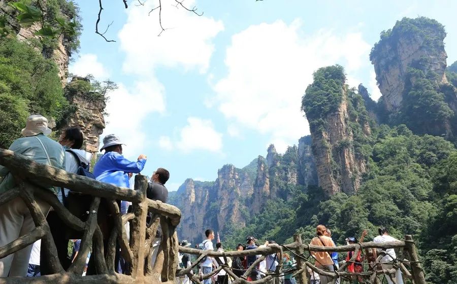 ▲ 暑期来临,游人在张家界市武陵源区百龙天梯观景平台游玩,一系列暑期旅游优惠政策,让旅游持续升温。(图片来源:湖南省人民政府官网)