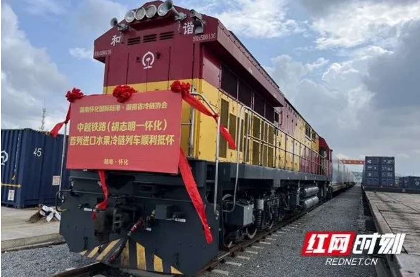 ▲ 近日,首列中越全程铁路冷链水果测试专列直抵湖南怀化。