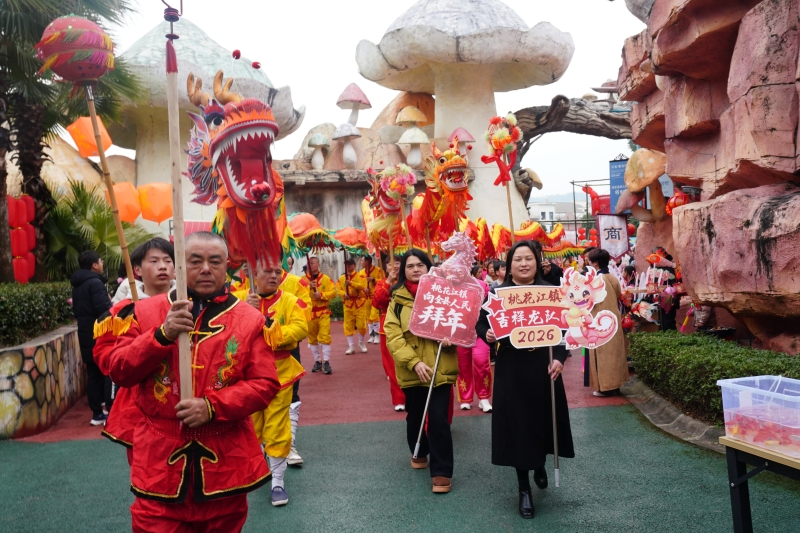 当天下午,伴随着铿锵锣鼓,舞龙表演率先开场,30余条色彩斑斓的长龙翻腾起舞,瞬间点燃现场气氛。随后,“一马当先·百龙呈祥·千人巡游”震撼登场,30多条彩龙组成方阵巡游,古风“桃花美人”、萌趣“元宵宝宝”手捧花灯巡街,笋宝、竹君子、桃仙子等特色IP人偶与群众热情互动。巡游队伍浩浩荡荡穿行景区,沿途市民与游客掌声、喝彩声此起彼伏,处处洋溢着喜庆祥和的节日氛围。
