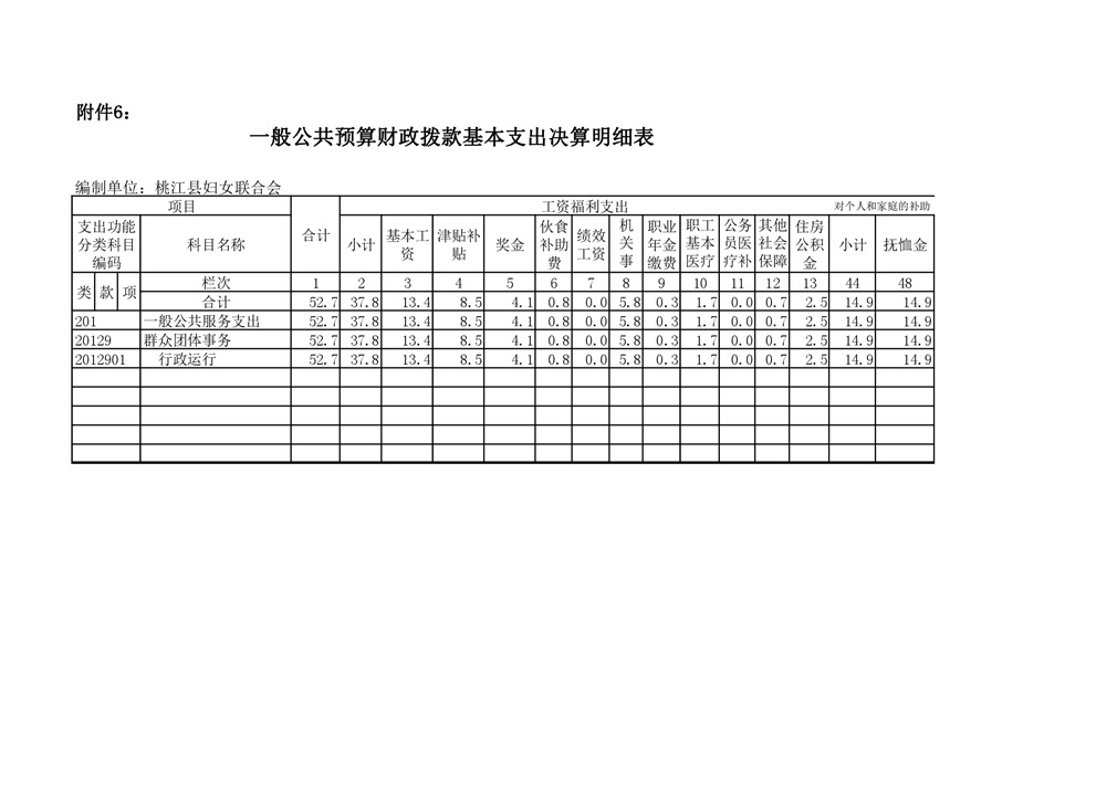2018 年财政拨款支出年初预算 81.51 万元,支出决算120.66 万元,完成年初预算的 148%。决算数大于预算数的主要原因是上级部门拨付政府性基金用于救助贫困妇女,工资提标后人员经费增加、追加退休干部卢国英丧葬费等。