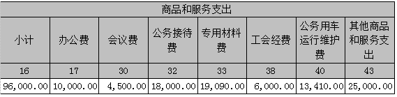 基本支出用于为保障机构正常运转、完成日常工作任务而发生的支出,包括人员经费和日常公用经费。 2019年,县财政批复的基本支出年初预算为93.4万元,决算为104.48万元。按经济科目划分,各项支出决算金额分别为:工资福利支出94.88万元;商品和服务支出9.6万元,其中,办公费1万元;会议费0.45万元;公务接待费1.8万元;专用材料费1.9万元;工会经费0.6万元;公务用车运行维护费1.35万元;其他商品和服务支出2.5万元。