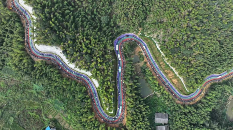 天空下着毛毛雨,可丝毫不影响我游玩的兴致。“如果人不多,大家可以到观光车上去躲一下雨。”进入景区,我听到工作人员对志愿者们说道,这让我觉得景区志愿服务工作的安排非常人性化。工作人员发现我是一名来自广东惠州的志愿者,便帮我拍了几张照片。随后我们相互加了微信,原来他叫汪鸿,是县城投公司的工作人员。汪鸿告诉我,目前是内测期,希望我能够把一路的感受告诉他,以便今后改进。我告诉他,步行上山这一公里左右路的两侧有一些垃圾,沿途垃圾桶摆放也比较少;护栏全部是封闭的,建议留两三个安全出口;一路带有宣传性的打卡拍照标志不多,建议在右边山坡画上壁画(比如桃江的百美人图等)。