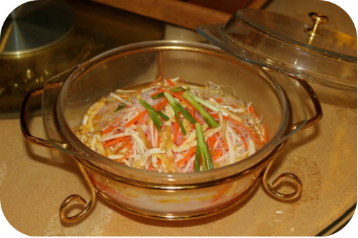 马迹塘和菜,是桃江马迹塘一带民间宴席上必不可或缺的菜肴,寓意和和美美、和气生财。以前马迹塘老街上红白喜事办宴席,虽不奢侈,却很讲究,有“四底、四荤、四汤、两素”之说。马迹塘和菜就是“四底”之属(亦叫碗底子),将粉丝、豆干丝、笋丝、胡萝卜丝等混合一起爆炒,曰之“和菜”。马迹塘和菜吃起来清脆爽口,鲜美回味,深受顾客的喜欢。