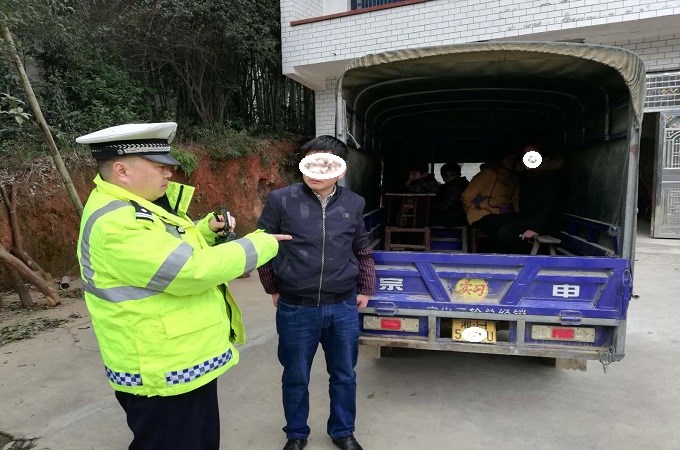 2月2日,该大队公路巡逻中队民警在桃修线枳木山村路段巡逻时发现一台违法载人三轮车,将其成功拦停。该车核载1人,实载5人,民警将车上超载人员卸载、转运,消除其违法状态,并耐心向驾驶员讲解三轮车违法载人的危害,指出其存在的交通安全隐患,让驾驶人从思想上受到警示教育,切实消除农用车交通违法行为带来的事故隐患。