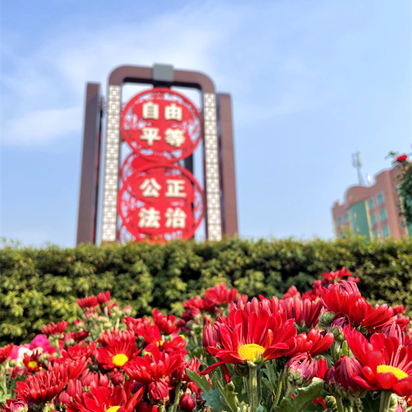 在县城金盆路转盘和休闲广场记者看到,工人们正用鲜花布置花坛,紫色的三叶堇、羽衣甘蓝、红黄色的万寿菊、粉色的送春花在阳光下竞相争艳,一排高高挂起的大红灯笼随风摇曳,为县城增添了浓浓的喜庆色彩。