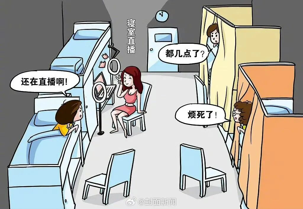 其二,被打乱的“生活节奏”。直播需要“流量时间”,可这个时间往往与室友的“休息时间”相撞。凌晨有开着补光灯直播、有道谢礼物的呐喊声,还有把直播道具堆放在过道……这些细碎的隐扰,久而久之便成了舍友之间“矛盾的导火索”,原本该互相体谅的宿舍,变成了“你直播,我煎熬”的对立空间。