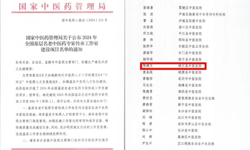 近日,国家中医药管理局公布2024年全国基层名老中医药专家传承工作室建设项目名单,桃江县中医医院党委书记陈建文名列其中。