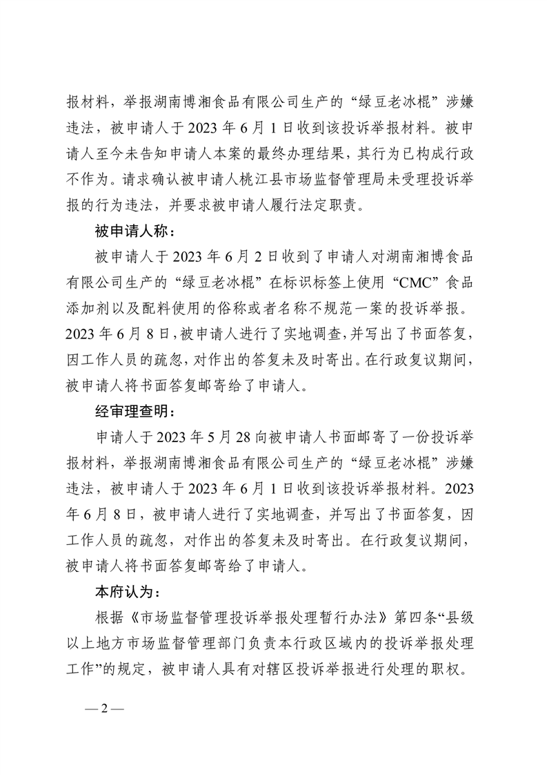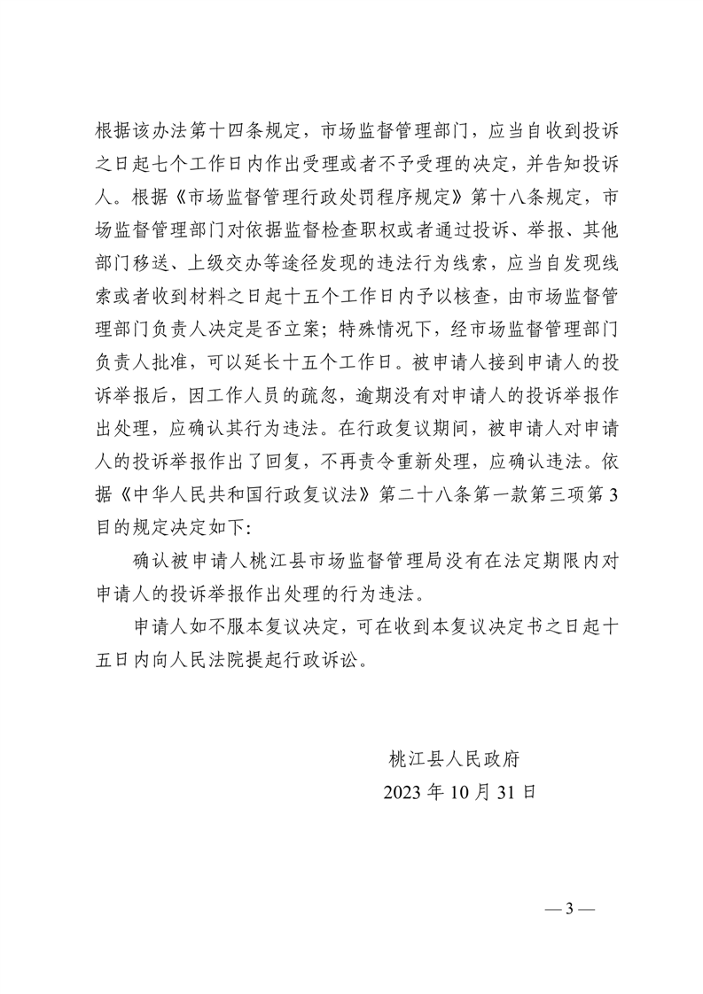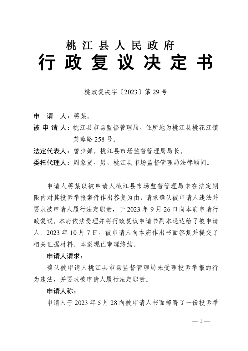行 政 复 议 决 定 书 桃政复决字〔2023〕第29号