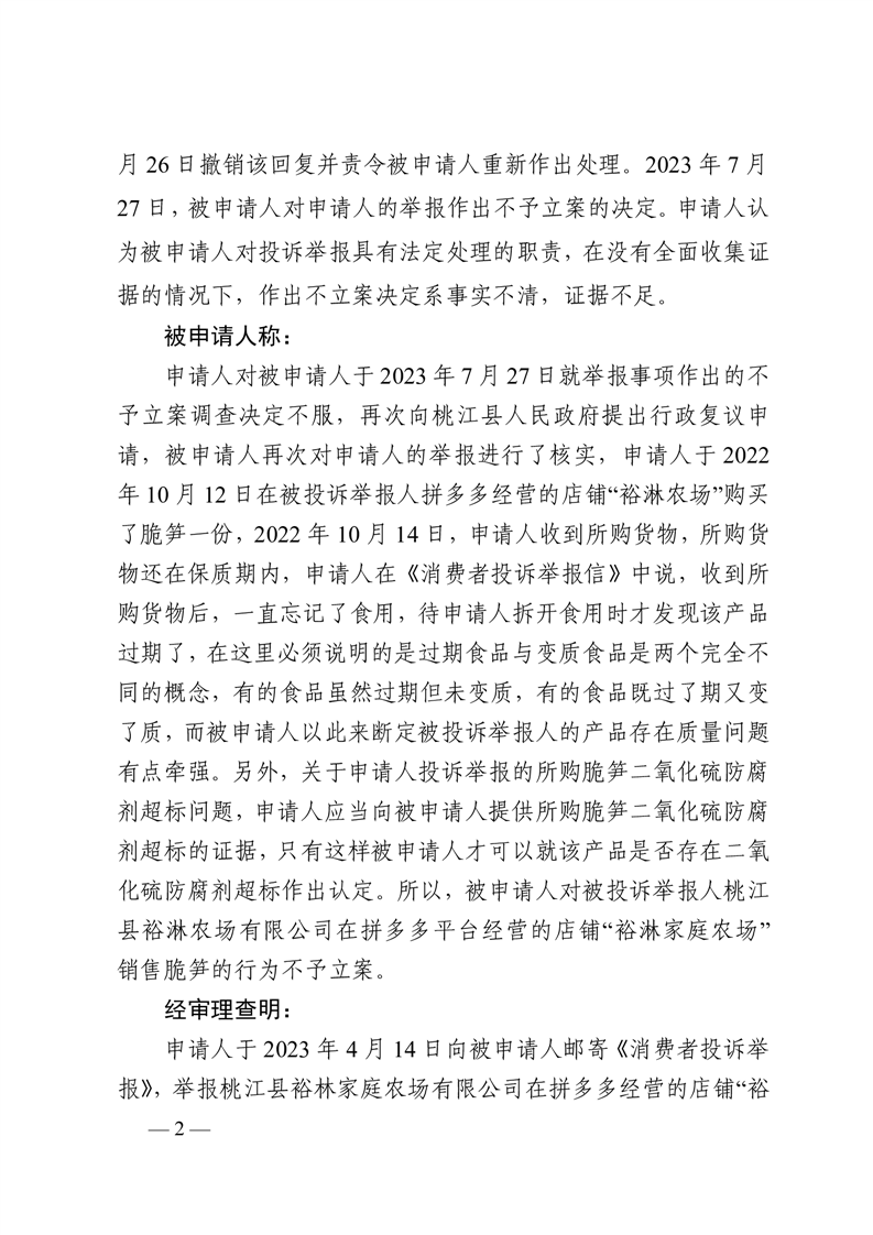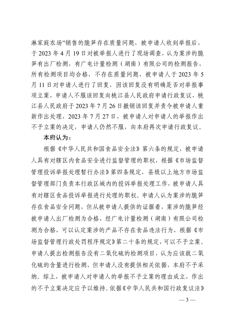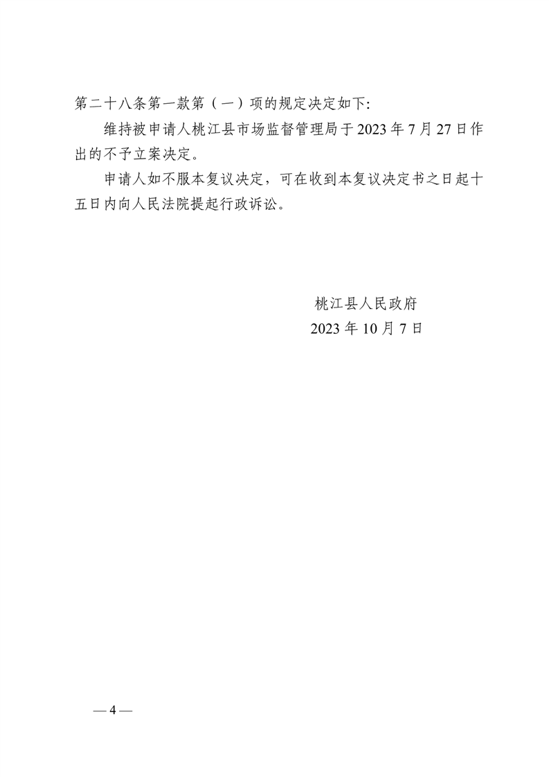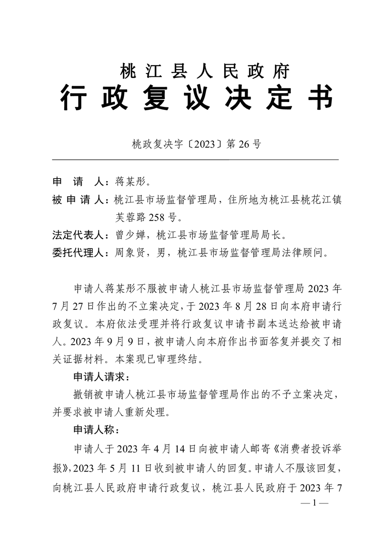 行 政 复 议 决 定 书 桃政复决字〔2023〕第26号