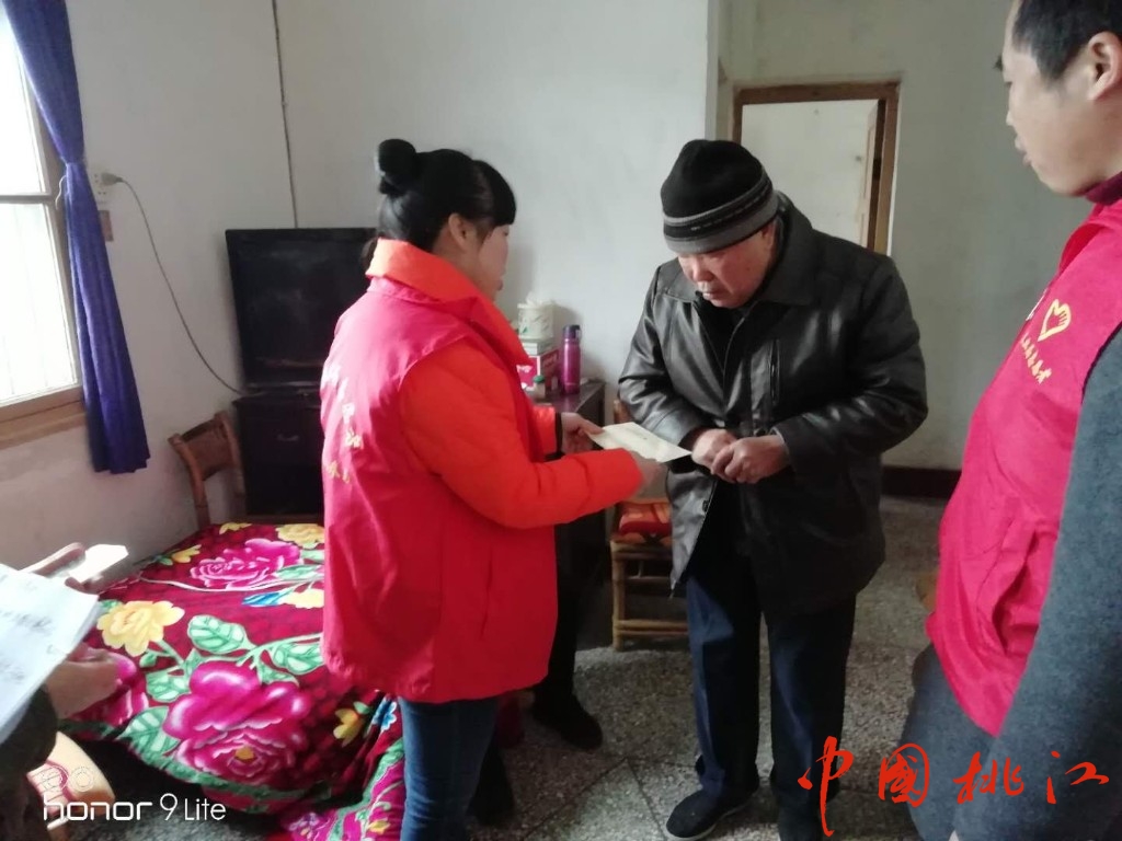 图为党员志愿者给退休干部送上慰问金