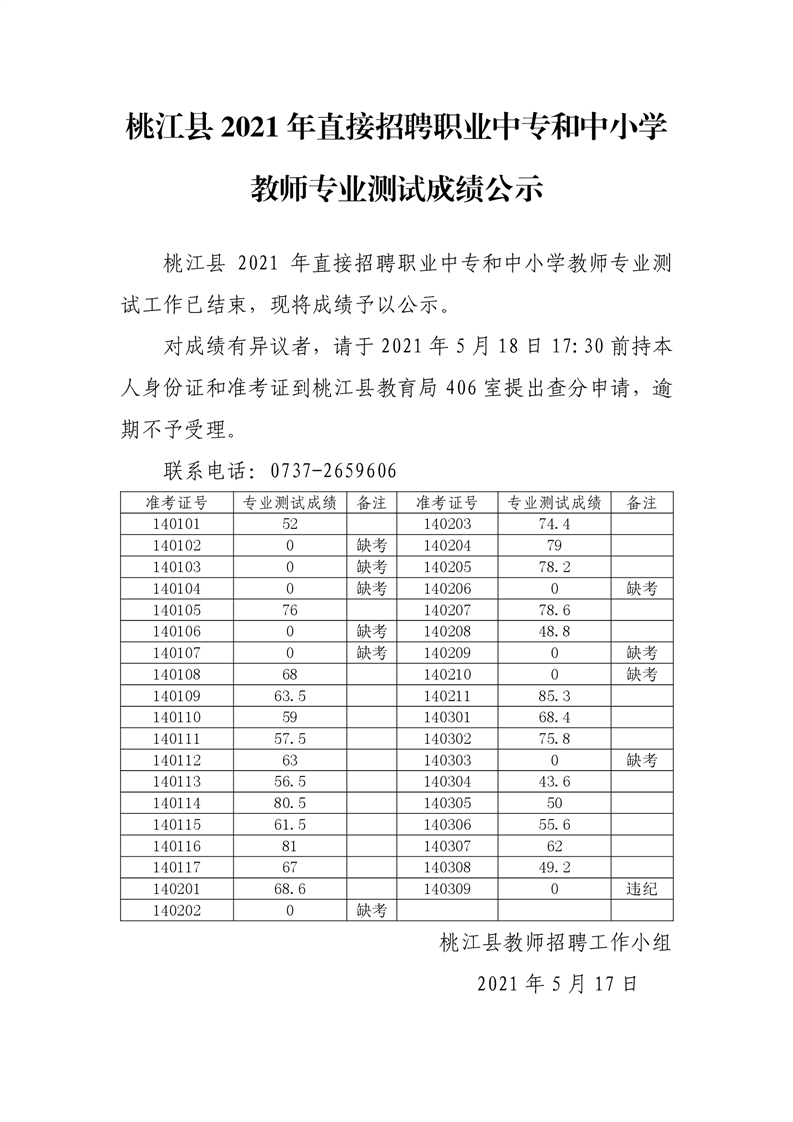 桃江县2021年直接招聘职业中专和中小学教师专业测试成绩公示