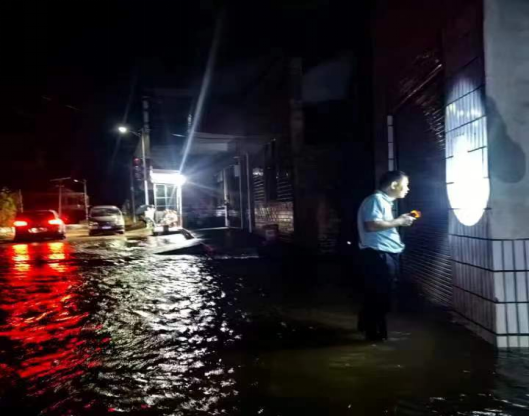 图为局领导7月1日夜间巡查积水严重牛田镇街道