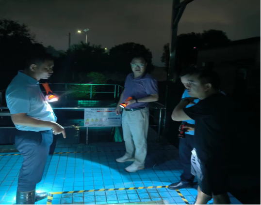 图为局领导一行7月1日夜间巡查第一污水污水处理厂的运行情况