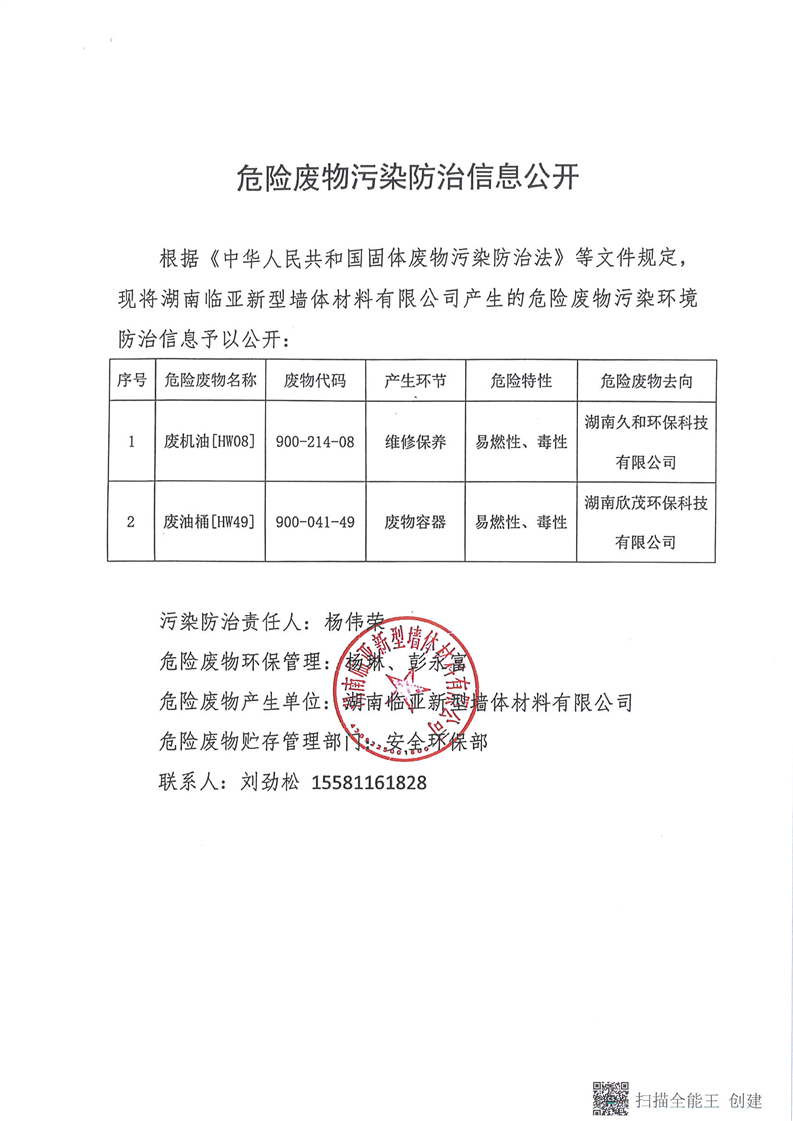湖南临亚新型墙体材料有限公司危险废物信息公示