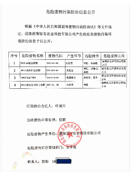 湖南惊石农业科技有限公司危险废物防治信息公开