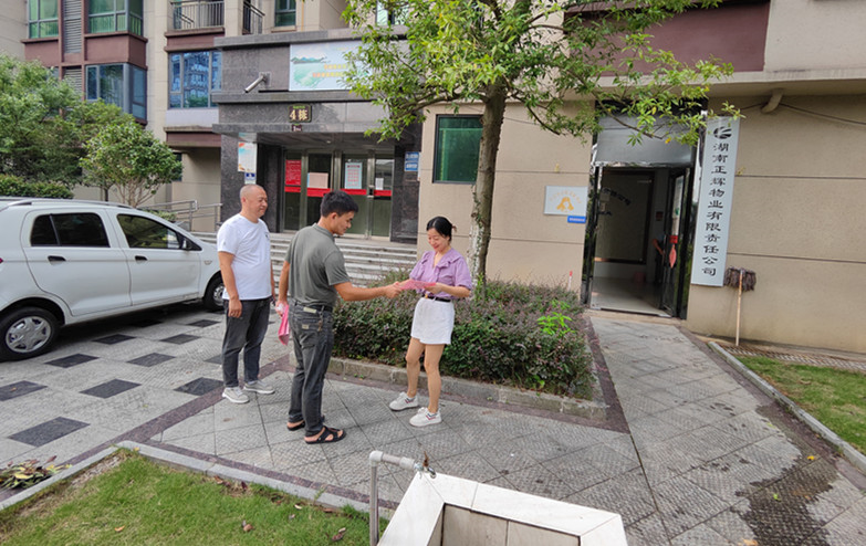 工作人员在物业小区发放宣传资料 贺日星 摄