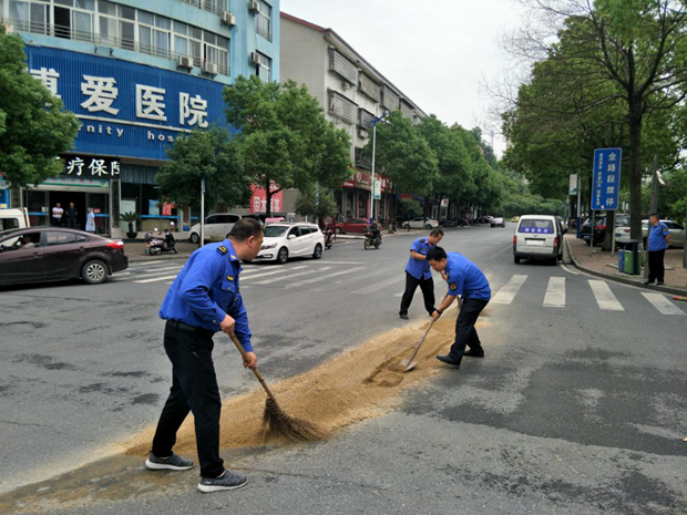 5月11日,县城管执法工作人员在日常巡查中发现金盆路与迎宾路交汇处路面有近10平方的砂石,严重影响市容环境,同时给行人和车辆带来安全隐患。执法工作人员坚持不等不靠、主动作为的工作作风,立即向周边商户借来几把铁锹和扫帚,迅速组织大家对该地段进行集中清扫。由于该段往来车辆较多,执法人员一面设置警示牌提醒过往车辆注意安全,一面迅速用铁锹把扫成堆的砂石快速进行清运。经过数十分钟的作业,路面终于恢复了干净,减少了交通安全隐患。