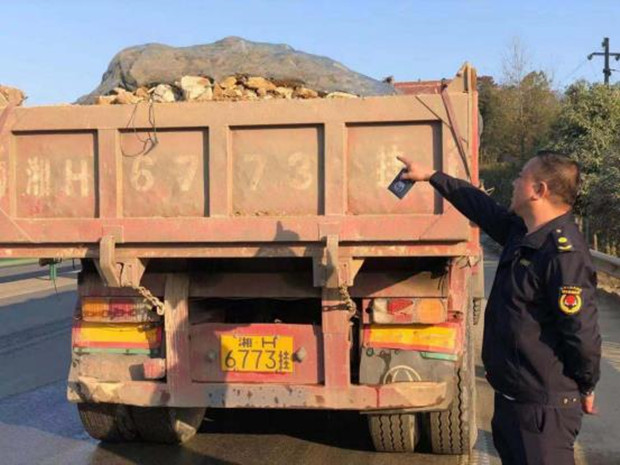 图为执法人员现场查获运输石块挂车,车辆覆盖不到位