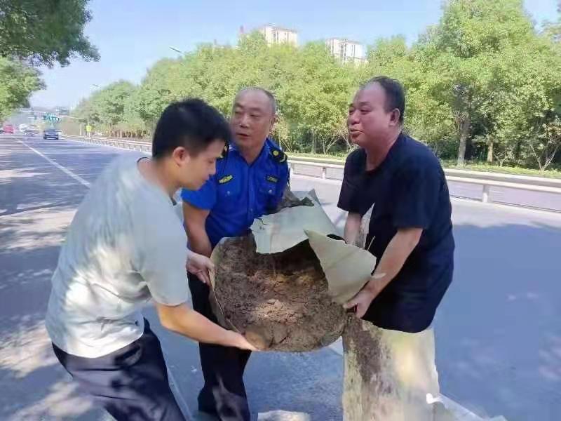 为及时消除安全隐患,执法人员找来铁锹等工具,对该路段的破损防撞桶进行清理。经过清理,该路段路障物被彻底清除,过往车辆得以安全顺利通行。