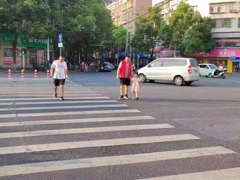 “您好,现在是红灯,乱穿马路非常危险,请您自觉遵守交规,谢谢!”