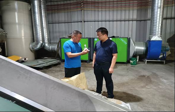 图为曾国栋一行在东莞考察竹塑新材料智能一体化托盘周转箱生产项目