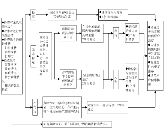 3.病情稳定患者。若危险性为0级,且精神症状基本消失,自知力基本恢复,社会功能处于一般或良好,无严重药物不良反应,躯体疾病稳定,无其他异常,继续执行上级医院制定的治疗方案,3个月时随访。