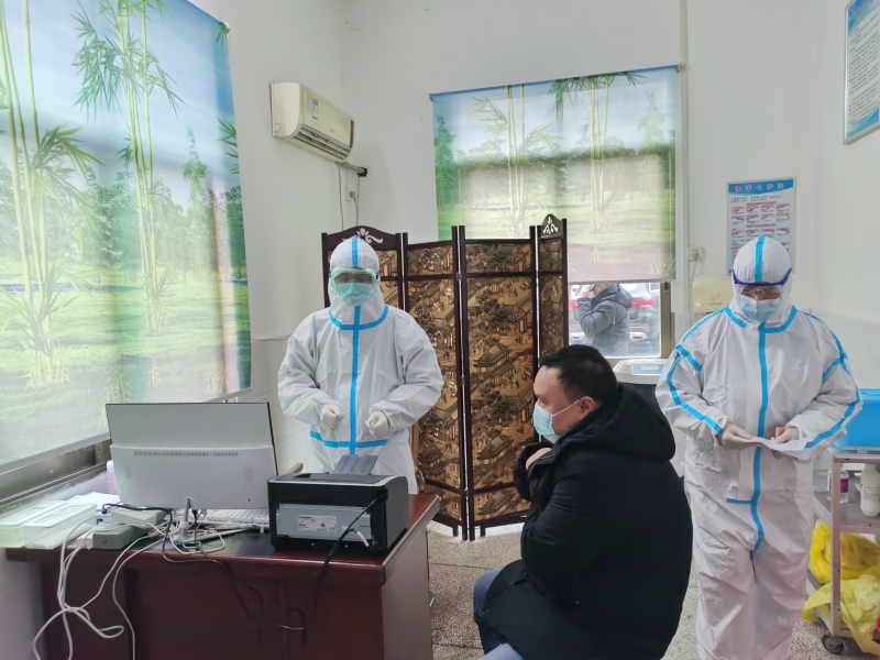下午三点,演练正式开始。演练模拟一名从河北地区返乡“发热、咳嗽、乏力”患者张某前来就诊。工作人员对张某进行体温监测,发现其体温为38.2℃。在查看健康码、询问旅居史及新冠病毒检测报告后,工作人员进行了详细登记,并立即通知专人通过专用通道将其引导至发热门诊。发热门诊医护人员对张某进行二次体温监测为38.3℃。通过询问病史和流行病学史,得知张某于2月1日从河北自驾车回三堂街老家,由家人提前向村委报备,患者到家后居家隔离观察,七日前的核酸检测结果为阴性,2月9日上午出现“发热、咳嗽、乏力”等症状,医护人员怀疑张某为疑似新冠感染患者,将患者留置于发热门诊。