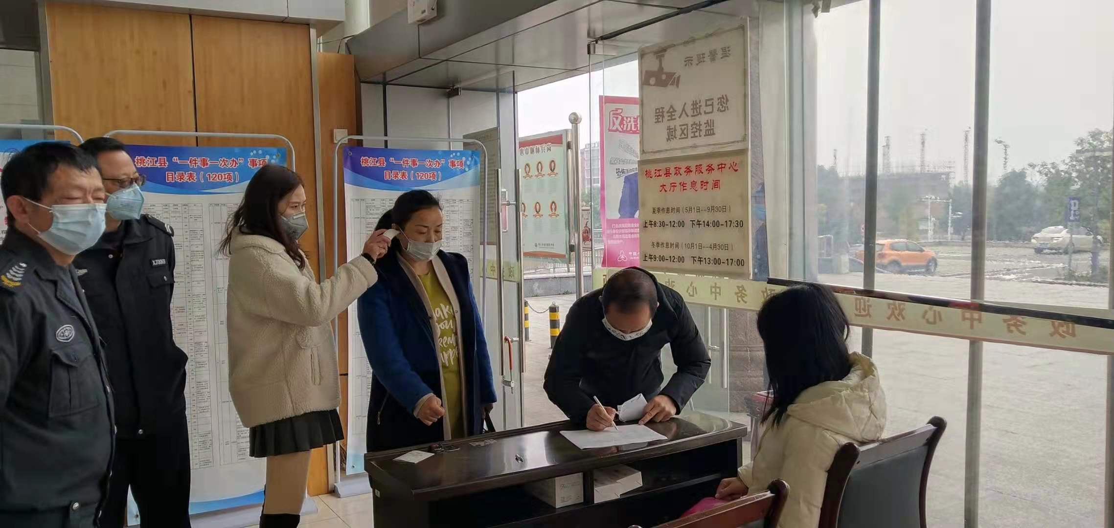 一是发出服务公告,全面广而告之。政务中心通过桃江政府网、桃江政务服务旗舰店、微信、QQ群等多种渠道将公告发至乡镇、村(社区),各窗口转发公告到朋友圈和微信群,尽可能做到家喻户晓,最大限度地减少来实体大厅办事群众的数量。二是调整受理方式,减少人员聚集。公布所有窗口电话,充分利用公安、税务、人社等自助终端,采取网上办、掌上办、预约办等方式为群众办理业务。各窗口安排工作人员值班,接受电话咨询、受理网上业务办理、处理预约业务,足不出户,即可在家轻松办理。三是认真做好防护,全力防控疫情。大厅以及桌椅、吧台、楼道、门片、厕所等一天一消毒。所有工作人员和进入大厅办事人员一律按规定戴好口罩,进行体温检测。停用电梯,做到“一张门进一张门出”,对来大厅人员做好登记,包括电话号码、身份证、体温等,有效控制人员流向。值班人员不集中就餐。