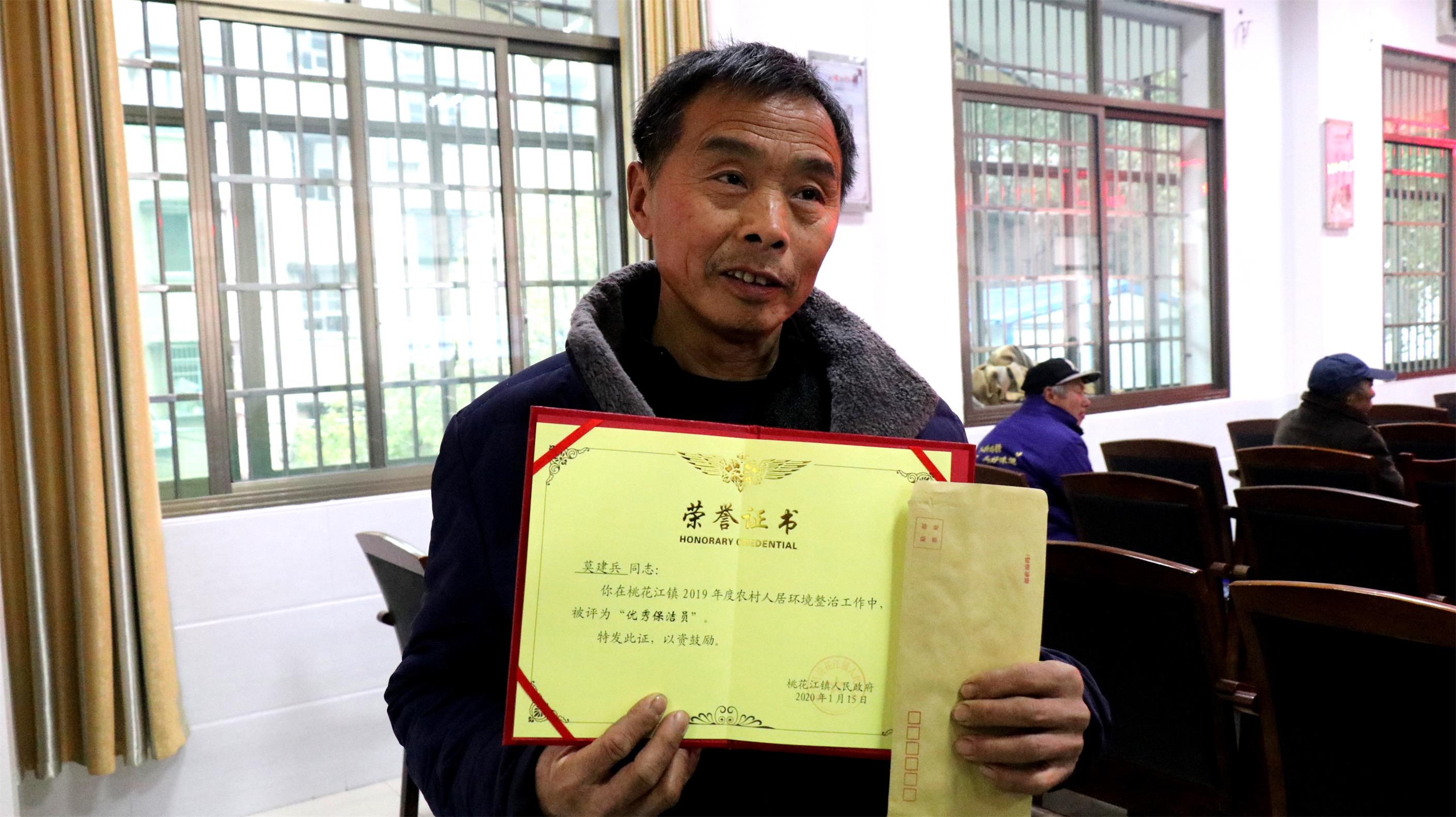“想不到搞卫生也能受表彰。”1月16日,在桃花江镇农村人居环境整治表彰大会上, 54岁的保洁员莫建兵被评为年度“优秀保洁员”,高兴不已。