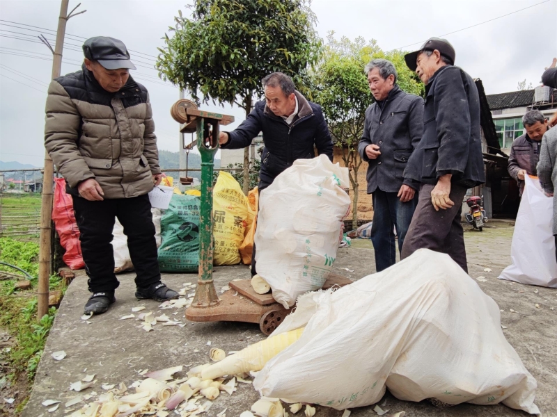 这些时日,像莫老一样挖笋卖笋的村民满村都是,在大华村的村道上,三轮车、摩托车、小轿车…各种满载着鲜笋的交通工具来往穿梭,除了村上的竹笋专业合作社统一收购,县域内不少竹笋加工公司也在村上设了收购点,村民们只要将新笋送过去,便可直接上称算钱。“整个村每天的产量起码上了4万斤。”大华村旭辉竹笋专业合作社负责人介绍,自27号开始,前来卖笋的竹农络绎不绝,光合作社每天就能收购2万多斤。经过去壳、分拣,品质最优的鲜笋被就近运往农贸市场销售,确保第一时间上餐桌,其余的笋经过蒸煮、浸漂、压榨、烘干等多道工序制成笋干,销往各地。
