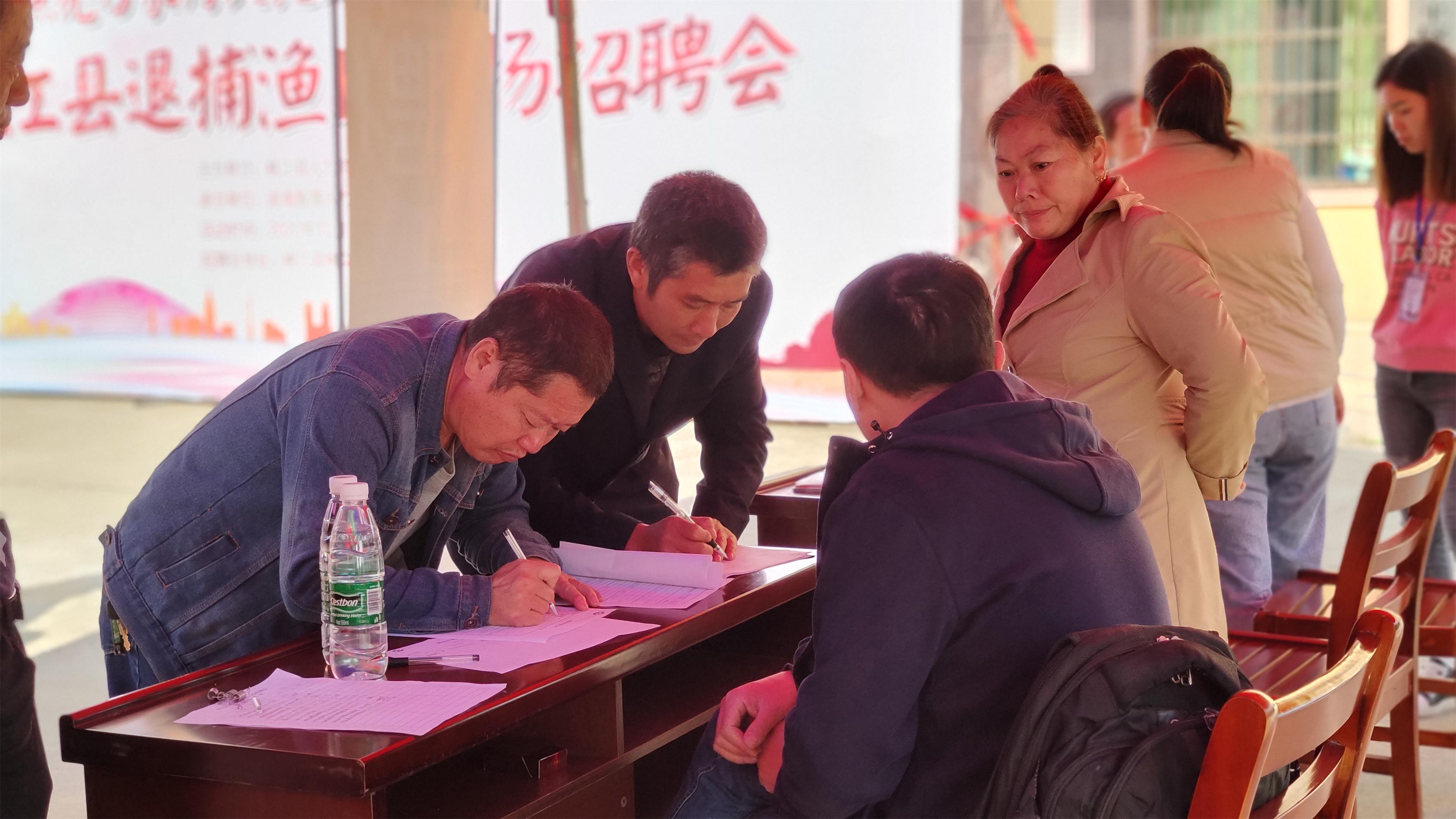 招聘会上共汇集了口味王、新兴管件、桃花江竹材科技等14家企业,提供岗位达790多个,涵盖普通生产工、操作工、保安、文员等普通工种和电工、焊工等技术工种。现场进场人数600多人,其中渔民近400人,达成意向人数112 人。此外,县人社局还指派专人发放了退捕渔民社保等相关政策资料,方便渔民获得更多的就业、社保、农民工维权等政策信息。