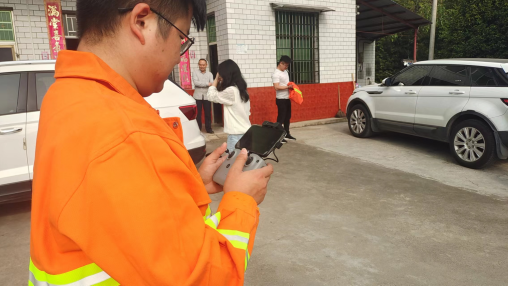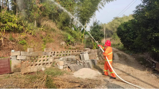 演练中,浮邱山村村委接到群众报警电话,称某处发现浓烟疑似火情,但无法确定具体位置。接到报警电话后,应急救援队通过无人机精准定位起火点,发出鸣笛警报,同时立即整队并配备灭火器材。救援队到达现场后迅速用灭火拖把进行火情处置。在指挥员的统筹调度下,队员们有序启用抽水机、消防水带、水枪等消防设备,对起火点进行喷水扑救,现场火势得到了及时有效的控制。