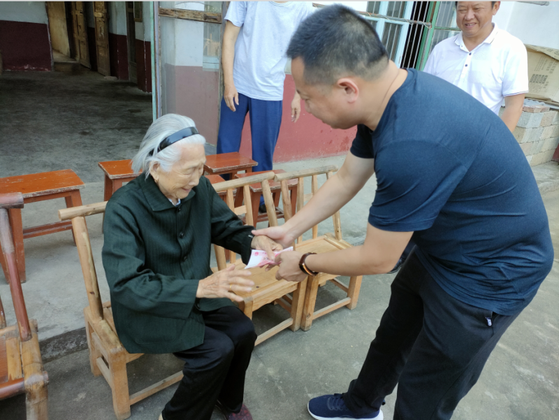 上图为薛浩镇长给胡炳乾老人送慰问金