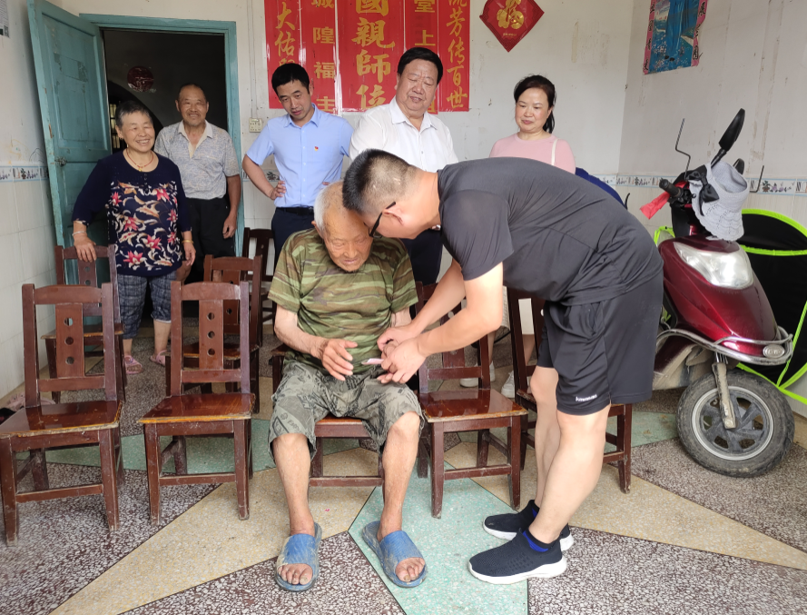 “胡大爷身体还好吧?端午节马上到了,我们来看望您,祝您身体健康、节日愉快!”在莲盆嘴村胡炳乾老人家中,慰问组为老人送上了慰问品和爱心粽子,并拉着老人的手关切地询问身体状况、日常起居、子女情况。尽管已经104岁,但胡大爷状态非常好,身体很硬朗,早上还为两块菜地除了草,胡大爷的胃口也特别好,每餐还能吃一大碗饭、一大碗肉。
