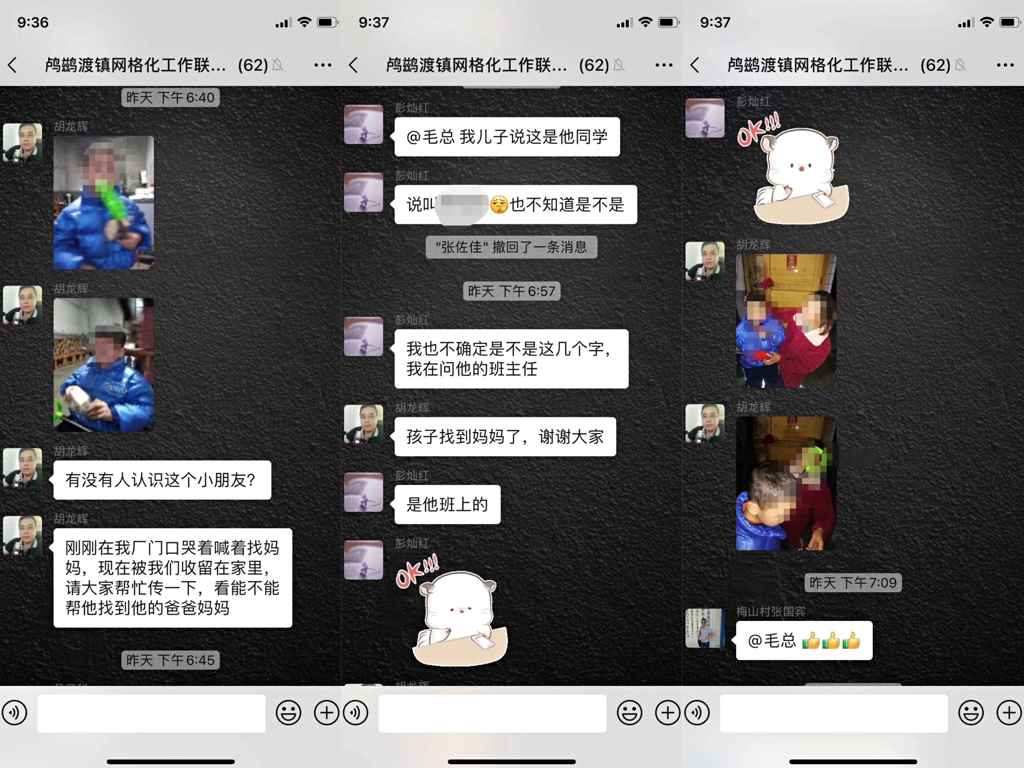 “有没有人认识这个小朋友?刚刚在我厂门口哭着找妈妈,现在被我们收留在家里,请大家帮忙传一下,看看能不能帮他找到他的爸爸妈妈。”3月17日下午18点40分,鸬鹚渡镇网格群内大塘村支书胡龙辉发布了一条寻人启事,各网格员迅速转发网格群、朋友圈,帮助寻找。