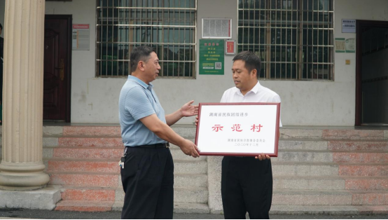 省委统战部副部长(兼)、省民宗委党组书记、主任向恩明将“湖南省民族团结进步示范村”的牌匾授予军功嘴村党支部书记李敏登。
