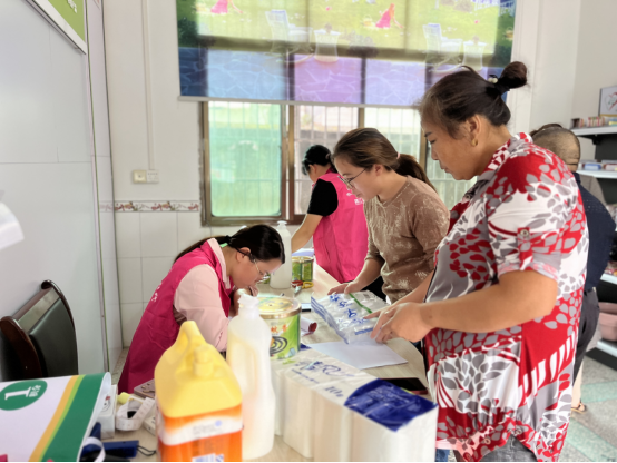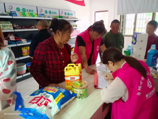 9月28日上午,军功嘴村热热闹闹地开展了一次爱心积分兑换活动,货架上摆放着牙刷、牙膏、纸巾、洗衣液、洗洁精等生活必需品作为可兑换物品,每种物品所需积分不等,农户根据积分卡,可自由挑选对应的物品。