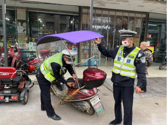 行动重点针对过往摩托车、电动车驾乘人员未佩戴安全头盔、违规安装遮阳蓬、逆行、超员驾驶、无牌无证驾驶、乱停乱放、闯红灯等违法行为进行逐一排查。同时,民警提醒广大摩托车、电动车驾乘人员,出行时务必戴好头盔,遵守相应交通法律法规,切勿违反禁令标志、标线指示,文明出行。