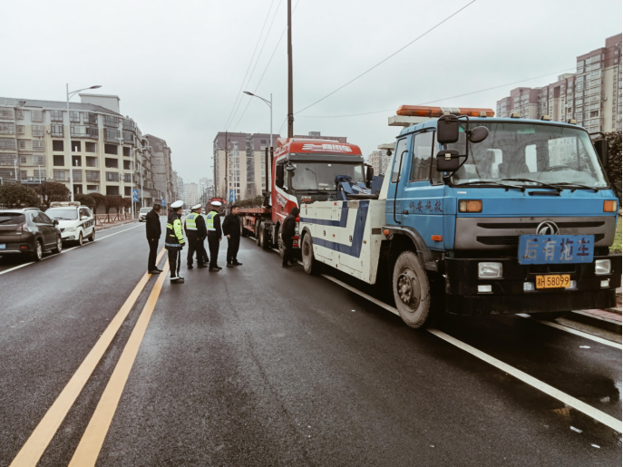 图:对劝导无效的大型货挂车强制拖离至社会停车场。