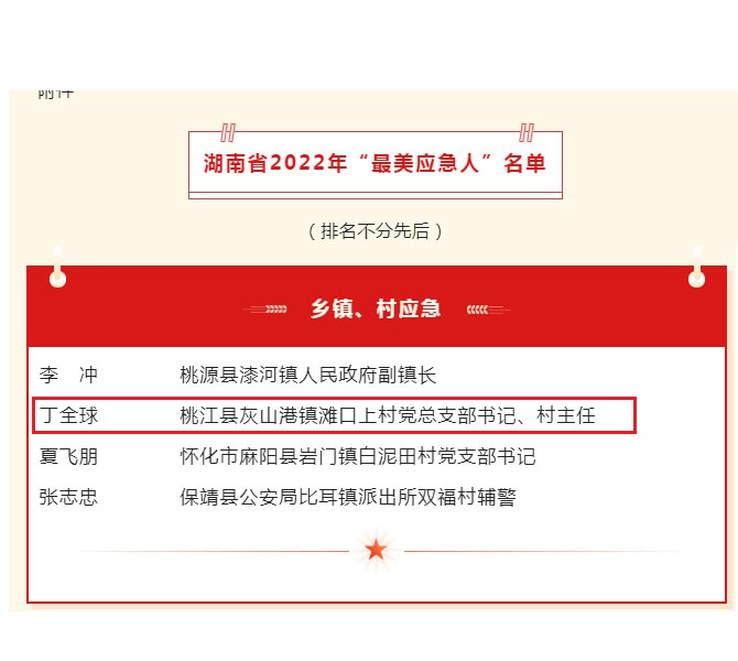 近日,笔者从省应急厅获悉,2022年湖南“最美应急人”揭晓,20名来自全省安全生产、防灾减灾救灾、应急救援领域的“最美应急人”脱颖而出。灰山港镇滩口上村支部书记丁全球光荣上榜,是益阳市唯一一位获此殊荣的个人。