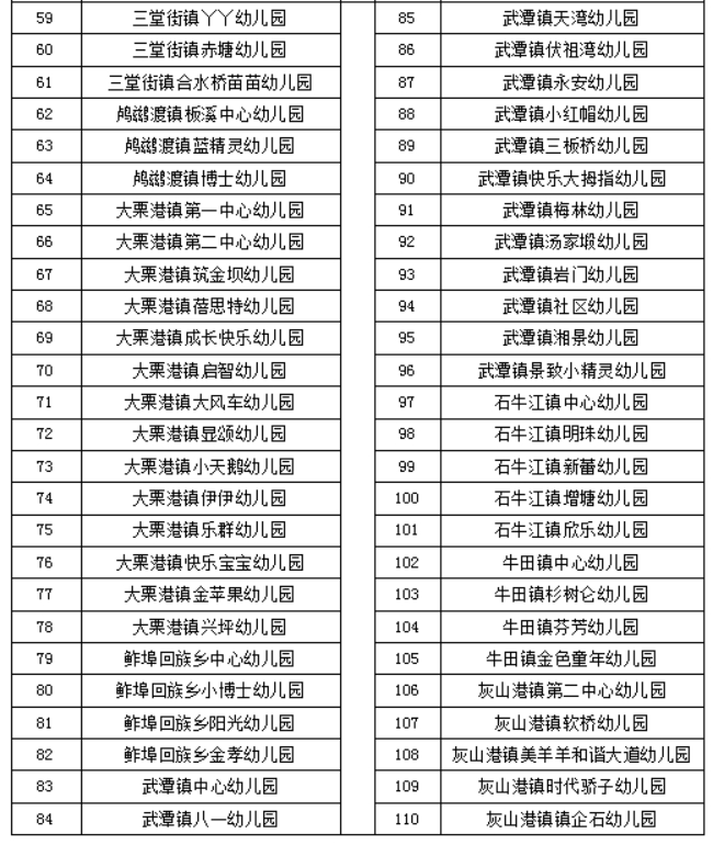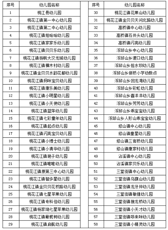 根据《桃江县教育局关于印发桃江县2020年幼儿园、特殊教育学校和校外培训机构复学复训工作实施方案的通知》等文件精神,经幼儿园自愿申请,县教育局会同公安、卫健、市监、交警、消防等有关职能部门对提出复学申请的单位逐园验收,认定以下单位已具备复学条件,可于2020年5月12日起组织复学。