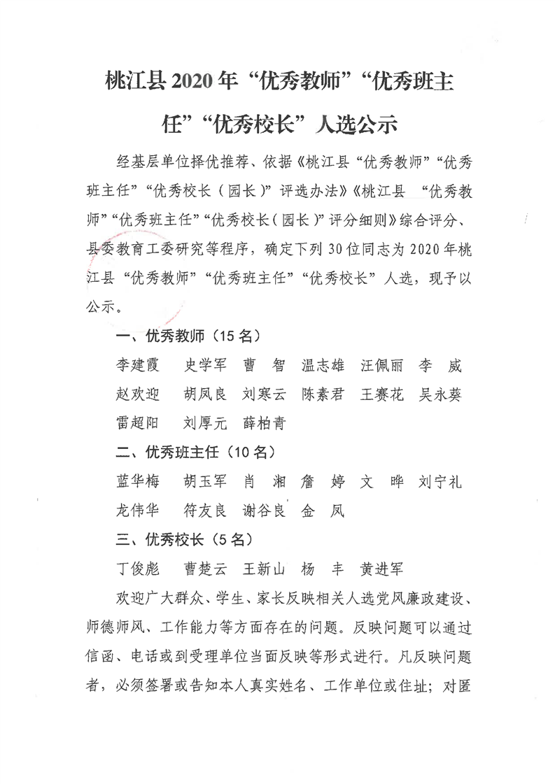 桃江县2020年“优秀教师”“优秀班主任”“优秀校长”人选公示