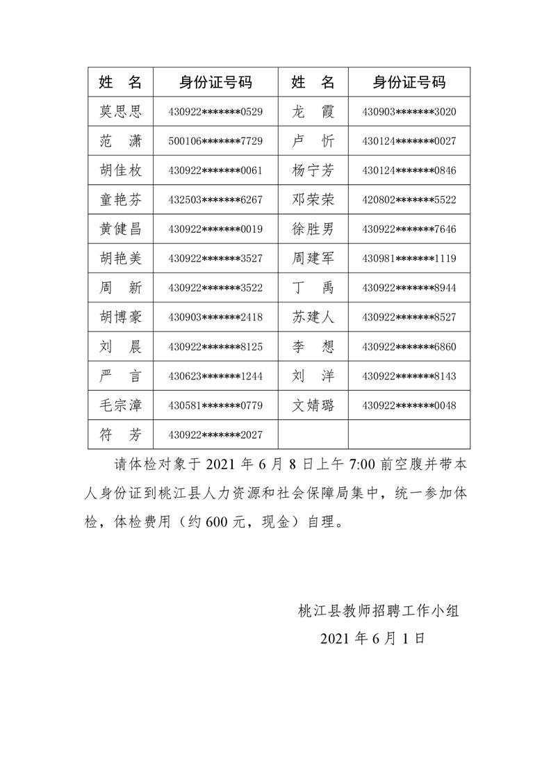 桃江县2021年直接招聘职业中专和中小学教师体检通知