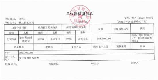 根据桃江县财政局预字〔2022〕0549号文件精神,现将桃财预〔2022〕0549号 1080万县级第四批财政衔接推进乡村振兴补助资金下达指标单进行公示。