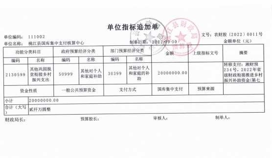 根据桃江县财政局农字〔2022〕0011号文件精神,现将湘财预〔2022〕234号 2000万省级第七批财政衔接推进乡村振兴补助资金下达指标单进行公示。