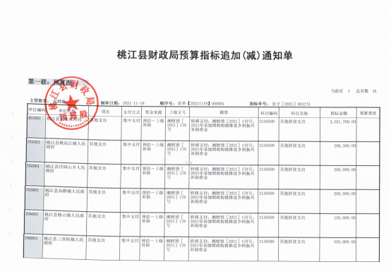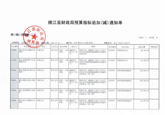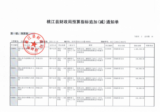 根据桃江县财政局农字〔2021〕0012号文件精神,现将湘财预〔2021〕178号 560万省级第四批财政衔接推进乡村振兴补助资金下达指标单及分配文件进行公示。