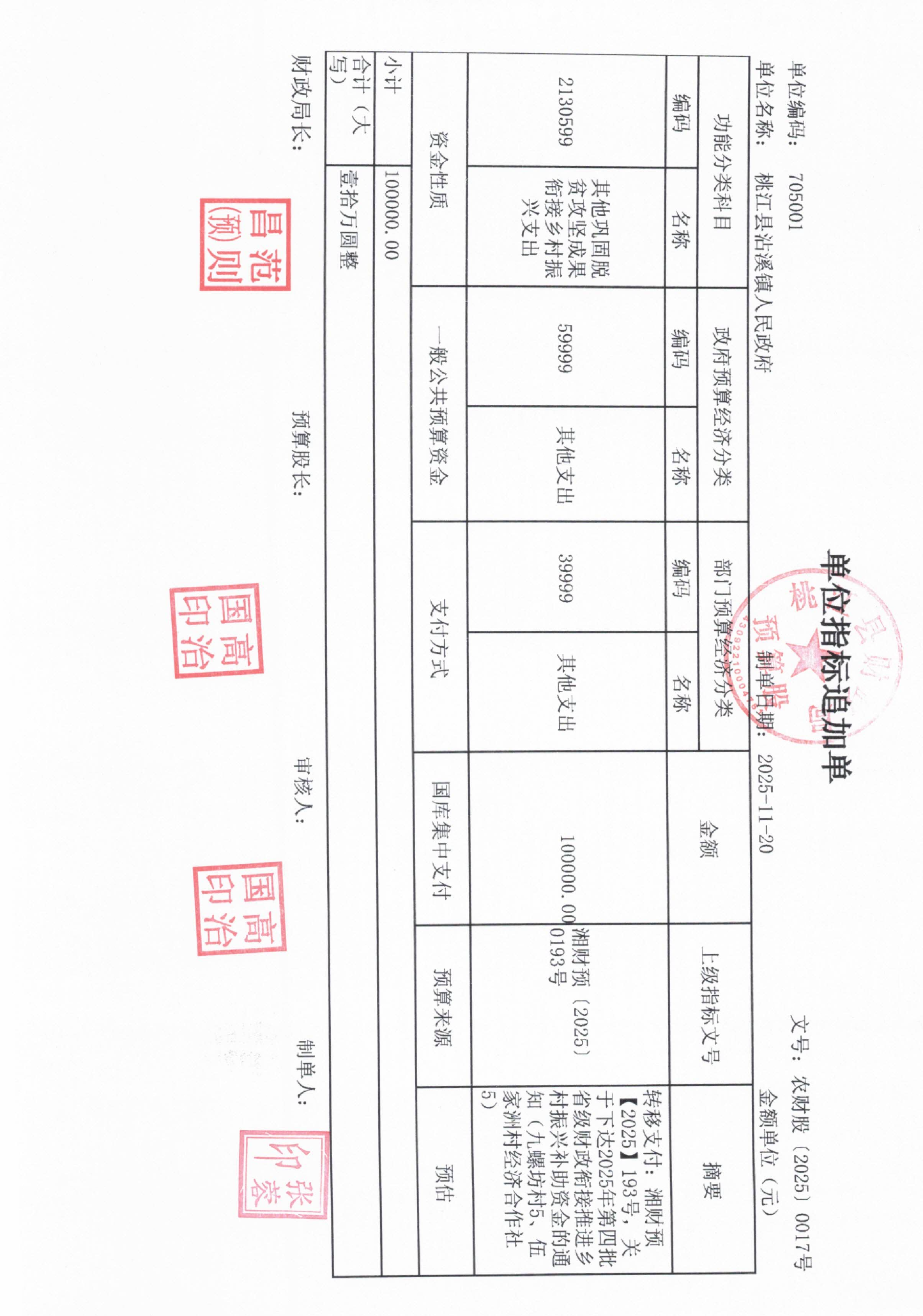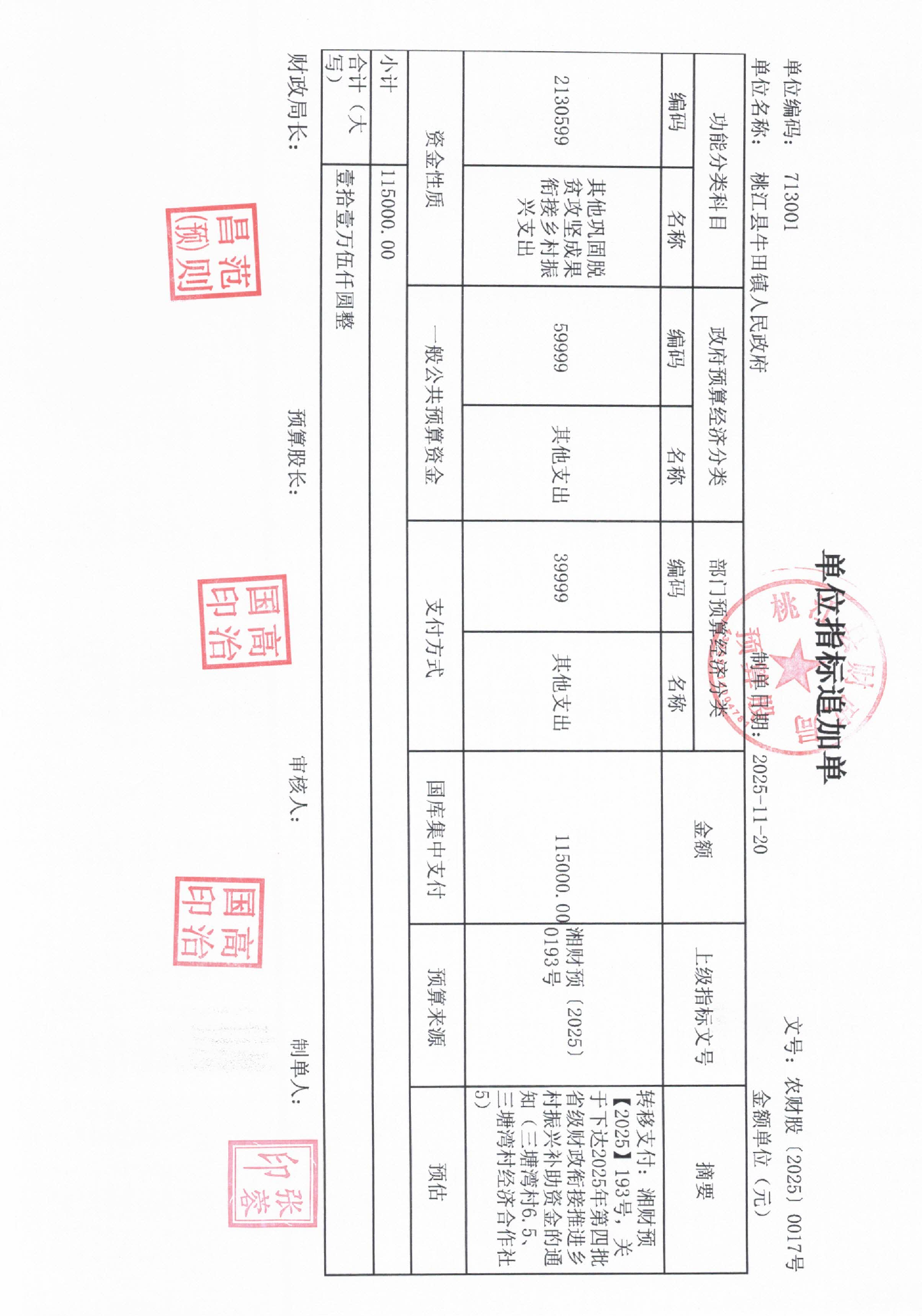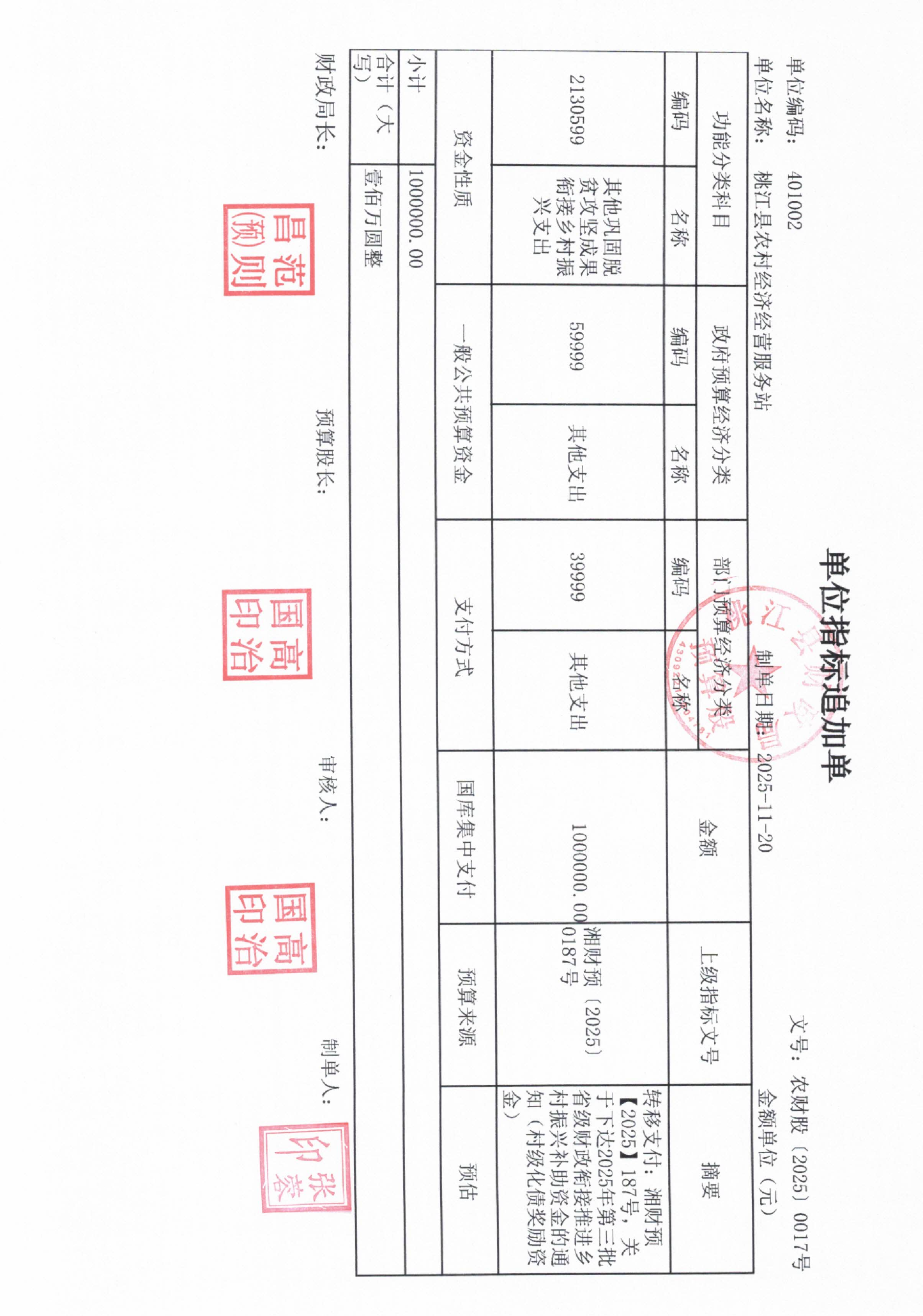 根据桃江县财政局农财股〔2025〕0017号文件精神,现将湘财预[2025]187号442万元,2025年省级第三批财政衔接推进乡村振兴补助资金下达指标单和湘财预[2025]193号467万元,2025年省级第四批财政衔接推进乡村振兴补助资金下达指标单进行公示。