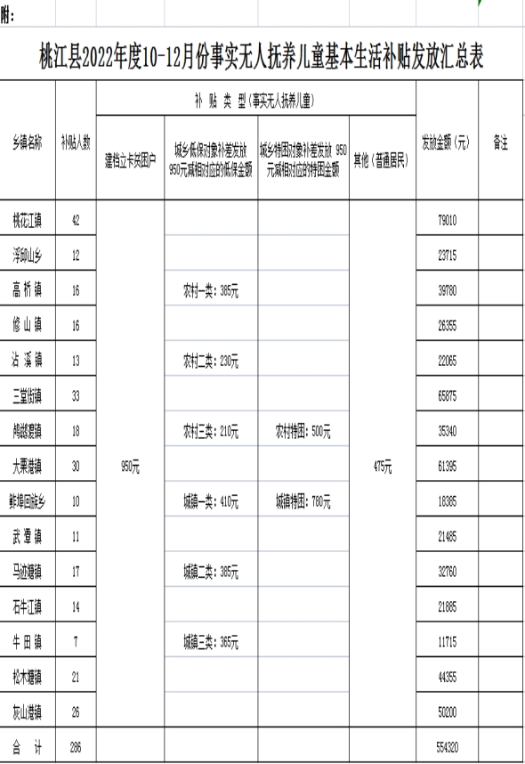 附:桃江县2022年度10-12月份事实无人抚养儿童基本生活补贴发放汇总表
