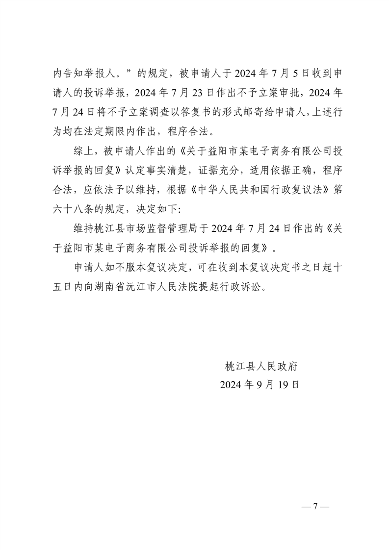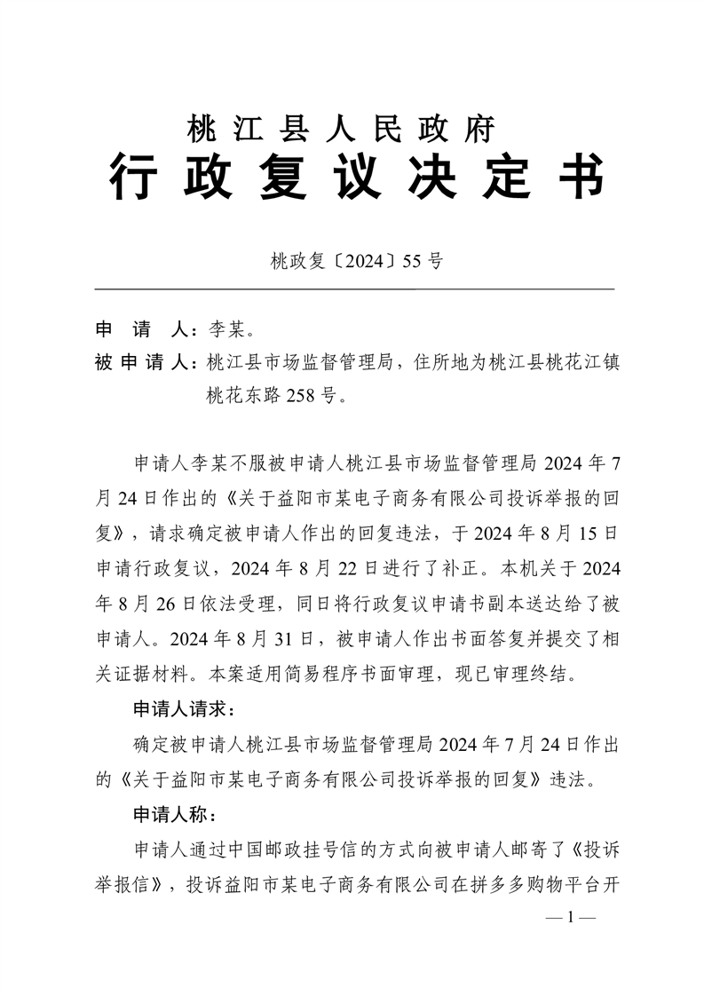 行 政 复 议 决 定 书桃政复〔2024〕55号